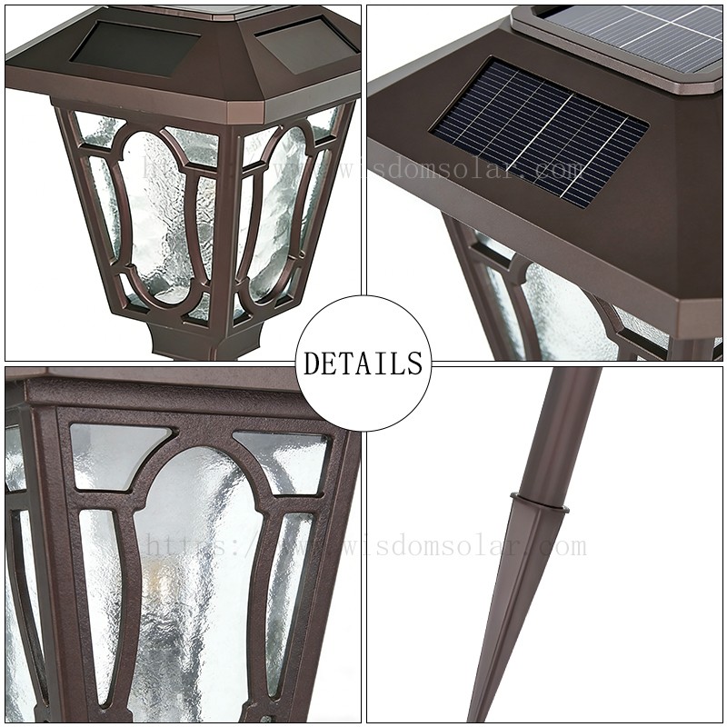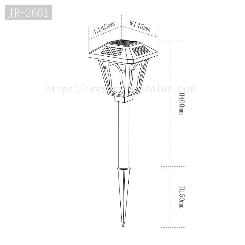 Specifications: JR-2601 Material: Aluminum+Glass+PC Solar panel:1.2W Height:40/60/80CM LED:1pcs Color Temperature:3000-6000K Battery:1000mah Working Time:6~8hous/Days Lamp Housing Color:Coffee/Black,etc Temperature Range:-20℃—+60℃ Protection:IP65 Application:Villa,garden,park,etc.